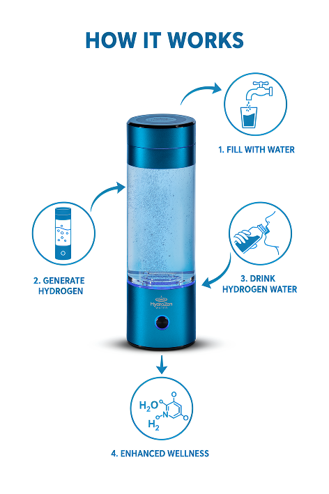 Our hydrogen water bottle works by infusing pure hydrogen gas into your drinking water through advanced electrolysis technology. Simply fill the bottle with clean water, press the button, and within minutes, the hydrogen molecules are activated, creating antioxidant-rich water. This hydrogen-infused water helps reduce oxidative stress, boosts energy, and supports faster recovery—keeping you refreshed and revitalized every day.